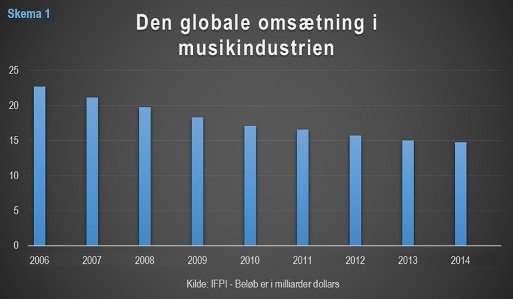 I skema 1 er musikindustriens samlende globale indtægter fra indspillet musik (digitale køb og streaming, cd og vinyl) i perioden 2006-2014. Tallene er leveret af IFPI, som er musikindustriens verdensomspændende brancheorganisation.