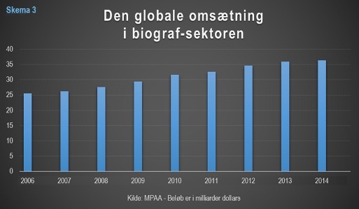 Skema 3 viser en fremgang i producenternes indtægter fra biograferne i perioden 2006-2014 på hele 30 %. Tallene er leveret af MPAA (Motion Picture Association of America), som har indsamlet data fra hele verden.