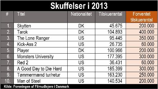 Årets nitten danske spillefilm blev i alt set af 4.061.843 tilskuere i biograferne, og den danske markedsandel nåede helt op på 29,6 % i 2013.