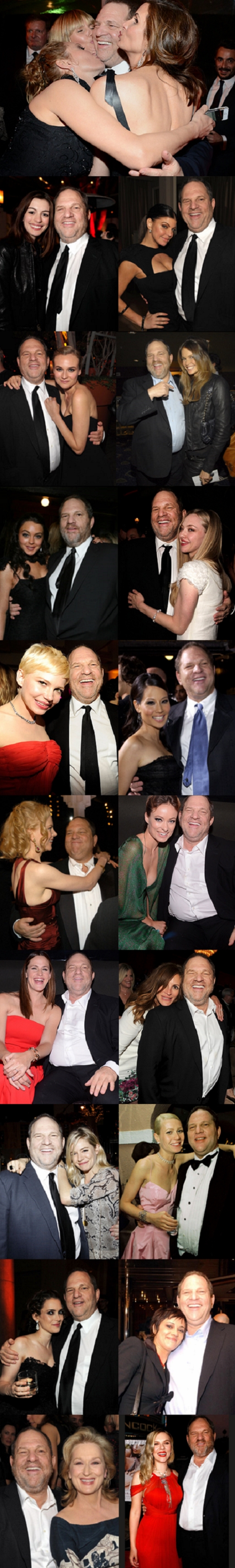 Blandt flere ting i denne sag, undrer specielt en enkelt. Når man gennemgår pressefotos af Weinstein gennem de sidste 30 år, ser man alle de største kvindelige filmskuespillerinde slange sig op af det angivelige sexmonter. (Se nedenstående lille udvalg af de mange pressefotos!).