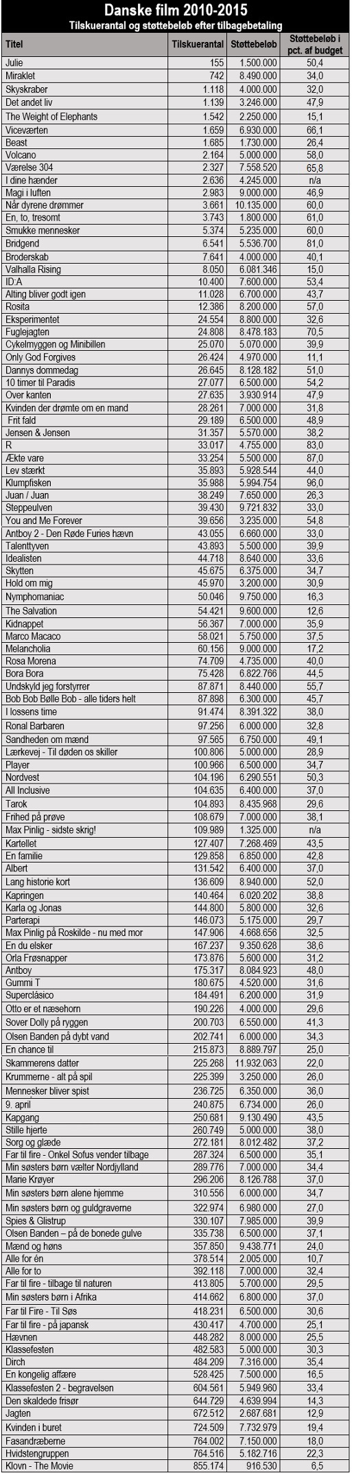 Her er en liste over, hvad staten har givet hver enkelt dansk biografgænger i baglommen på de enkelte film gennem de seneste fem et halvt år. Beløbene, som de enkelte film har været i stand til at tilbagebetale til staten, er naturligvis fratrukket.