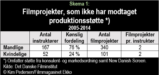167 mandlige instruktører har fået støtte til 340 filmprojekter, for kvinderne er tallene 52 instruktører og 101 filmprojekter. Altså gennemsnitligt to filmprojekter pr. instruktør, både for mandlige og kvindelige.
