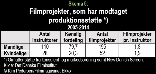 I skema 5 ser, at vi kvindelige instruktører gennemsnitligt får flere projekter igennem end deres mandlige kolleger.