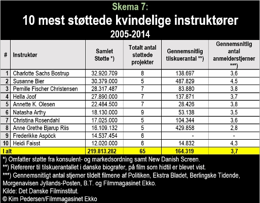 Skema 7 og 8 viser top ti over de mest støttede danske filminstruktører i perioden 2005-2014 fordelt på kvindelige og mandlige.