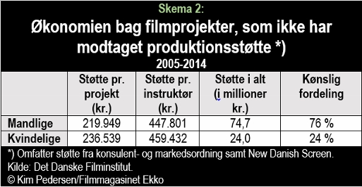 I skema 2 kan man iagttage, at kvindelige instruktører modtager tre procent mere i udviklingsstøtte pr. instruktør end deres mandlige kolleger. For udviklingsstøtte pr. film er tallet syv procent i de kvindelige instruktørers favør.