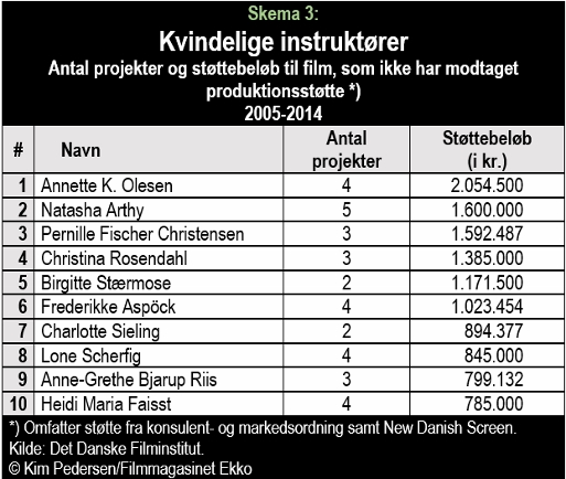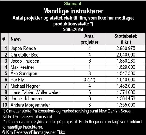 Opdatering! Flere filminstruktører, deriblandt Per Fly, Hella Joof, Natasha Arthy og Ole Christian Madsen har henvendt sig til mig for at få afstemt de oplysninger, der forefindes blandt støttetildelinger på Filminstituttets hjemmeside og deres egne. I de tilfælde, der har kunnet findes enighed om film, som på grund af ændret titel undervej, har figureret flere gange og mine beskrevne præmisser for undersøgelsen, er tallene nedenstående blevet rettet.