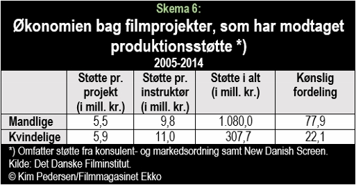 I skema 6 kan det iagttages, at kvindelige filminstruktører får elleve procent mere i støtte pr. instruktør og syv procent mere pr. film på produktionsstøttede projekter.