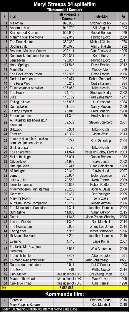Nederst i denne blog er en liste over samtlige film, hun har medvirket i samt de danske tilskuerantal i biograferne. Sammenlagt har 6,5 millioner danske biografgængere oplevet Streep på det store lærred.