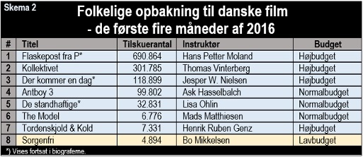Og så er der lavbudget-filmene. Jeg har tidligere, over flere omgange, påvist at lavbudget-film – trods filminstruktørernes forventninger – aldrig vil kunne bringe den nødvendige økonomiske saltvandsindsprøjtning til dansk film. Så ingen grund til at bore yderligere i dette.