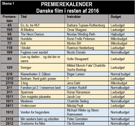 Det nye er, at premierekalenderen nu bugner af lavbudgetfilm. Se skema 1 herunder. At publikums forventninger til underholdning på det store lærred ikke imødekommes af lavbudgetfilm, kan ses i skema 2.