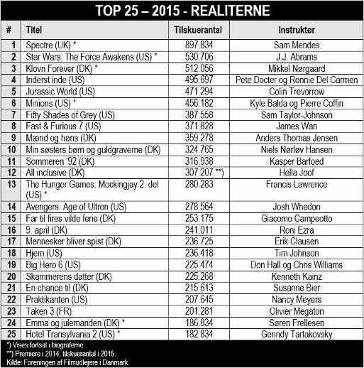 Til gengæld ramte jeg nogenlunde plet med Spectre, Klovn Forever, Fifty Shades of Grey, Mænd og høns og Min søsters børn og guldgraverne. De levede alle op til mine forventninger, selv om jeg nok havde forventet et noget større tilskuerantal på Klovn Forever.