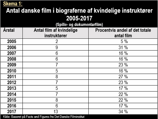 Til trods for at kvindelige danske instruktører står for 34 procent af danske film, har deres film nemlig kun folkelig opbakning fra syv procent af biografgængerne til danske film. Hvis vi isoleret ser på spillefilm, stod kvindelige instruktører for 22 procent af filmene, men kun fem procent af tilskuerantallet.