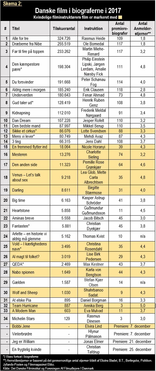Se skema 2 med dansk films resultater i 2017.