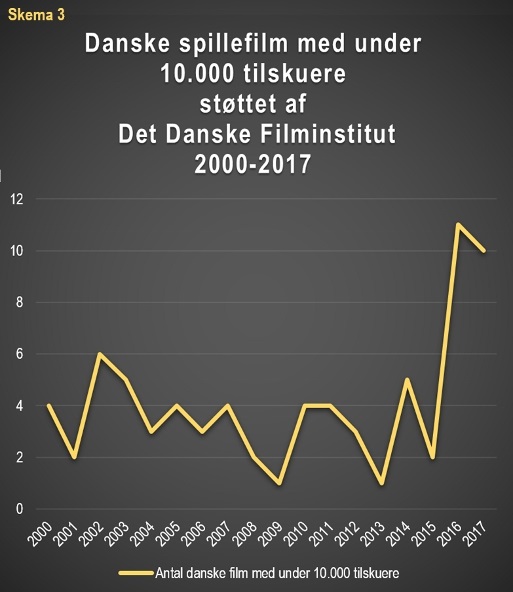 Beklageligvis er Filminstituttets udokumenterede postulat blot endnu et eksempel på, hvordan mange i den danske filmbranche vender det blinde øje til den virkelige årsag: At Filminstituttet har støttet og haft hovedfokus på en pokkers masse billige film, som ikke har haft antydningen af publikumsappel. Danske film set af under 10.000 tilskuere har taget himmelflugt. Se skema 3 nederst.