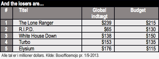 Både The Lone Ranger og R.I.P.D. satte nye standarder for, hvor mange penge et amerikansk studie kan tabe på deres produktioner. Disney har allerede afskrevet $150 mio. på Johnny Depps fiasko i deres regnskab og det endelige tab estimeres til $190 mio. Robert Schwentkes action-komedie R.I.P.D. med Jeff Bridges og Ryan Reynolds, som ikke engang bliver udsendt i de danske biografer, følger The Lone Ranger pænt til dørs, med et tab på ikke under $100 mio.