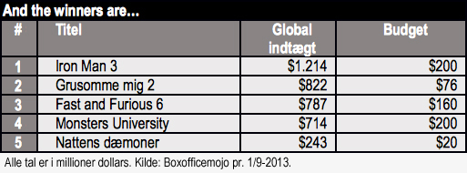 Robert Downey, Jr. i Iron Man 3 og Vin Diesel i Fast and Furious 6 vil blive takket af deres børnebørn, da det kræver mere end én generation at bruge alle indtægterne fra de to film. Med Grusomme mig 2 og Monsters University blev det bevist, at computeranimation fortsat har et solidt tag i publikum.