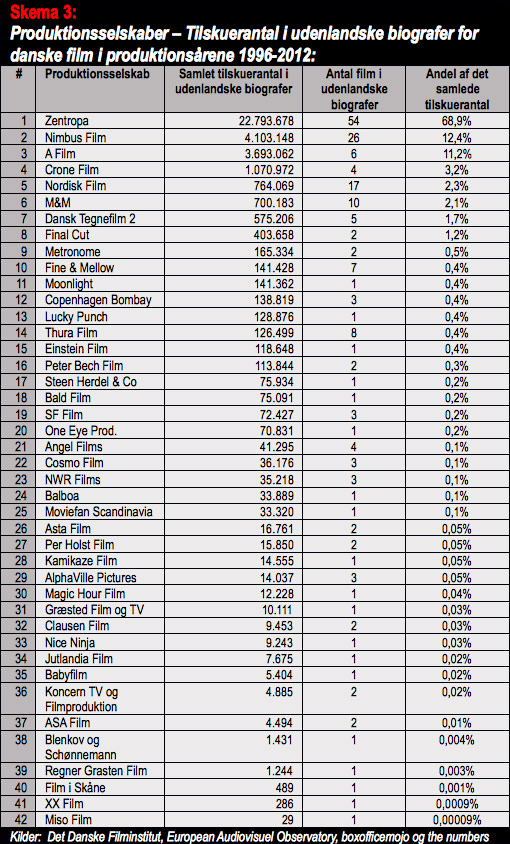 Nedenstående kan det også konstateres, at selskaber, som er stærke på hjemmemarkedet, såsom ASA Film, Regner Grasten Film og Thura Film, er skygger af sig selv på det udenlandske marked. Fridthjof Film er slet ikke repræsenteret, idet selskabet slet ikke har haft spillefilm vist i udenlandske biografer. ”Armadillo”, som høstede 74.190 tilskuere i udenlandske biografer, var jo en dokumentarfilm.