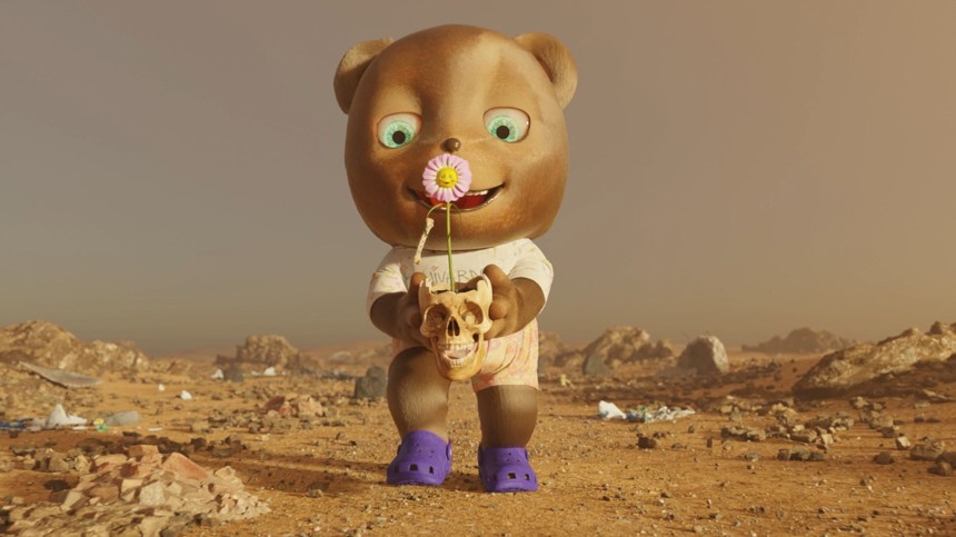 En sød bamse med blenumse og Crocs bevæger sig rundt i en gold, postapokalyptisk verden.